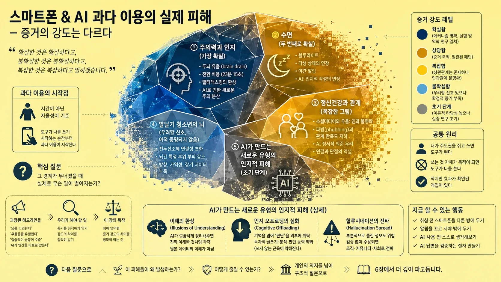이 장은 그 질문에 답하려 합니다. 스마트폰과 AI 과다 이용과 관련된 실제 피해 증거를 가능한 한 정직하게 읽어보려 합니다. 확실한 것은 확실하다고, 불확실한 것은 불확실하다고, 복잡한 것은 복잡하다고 말하겠습니다.